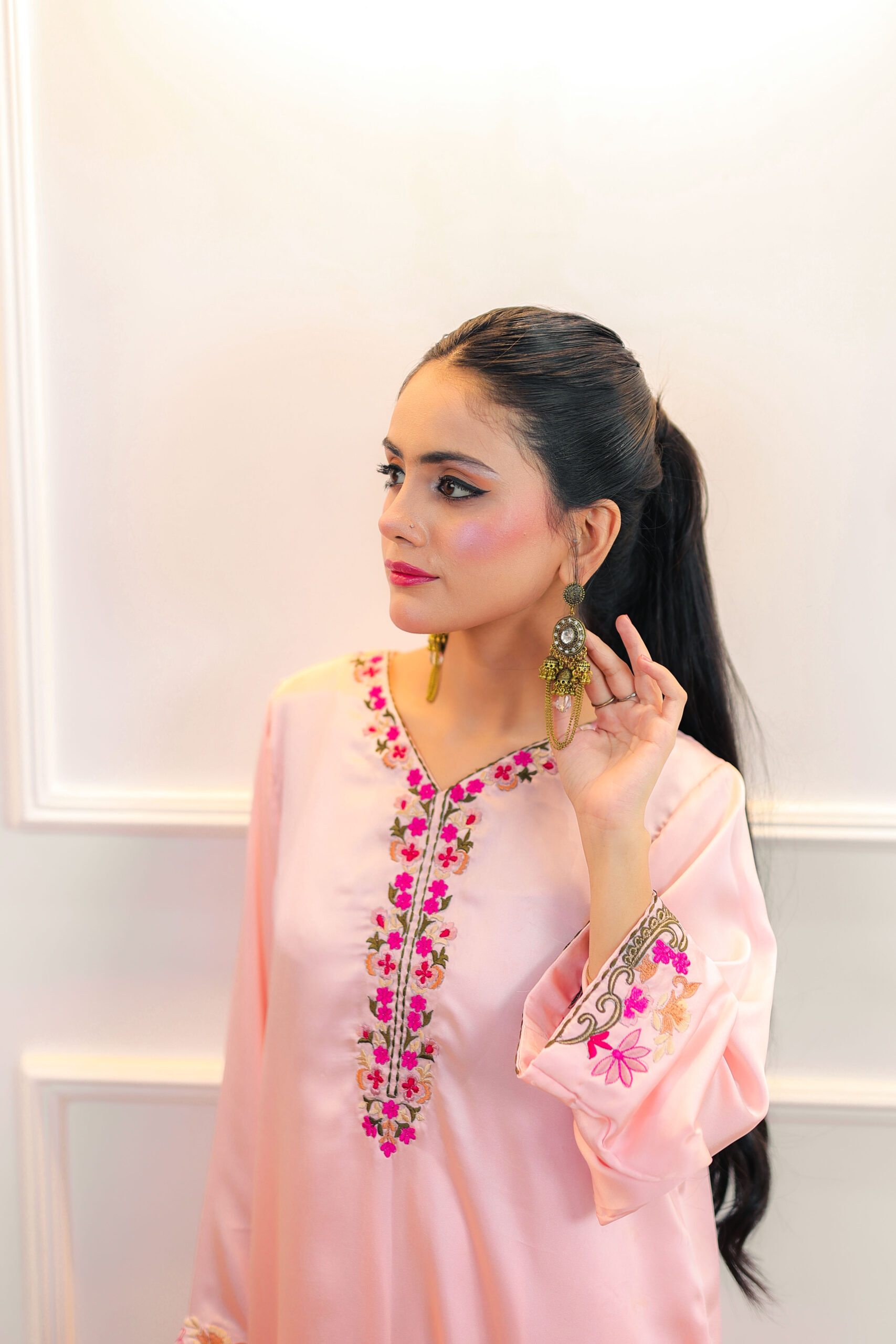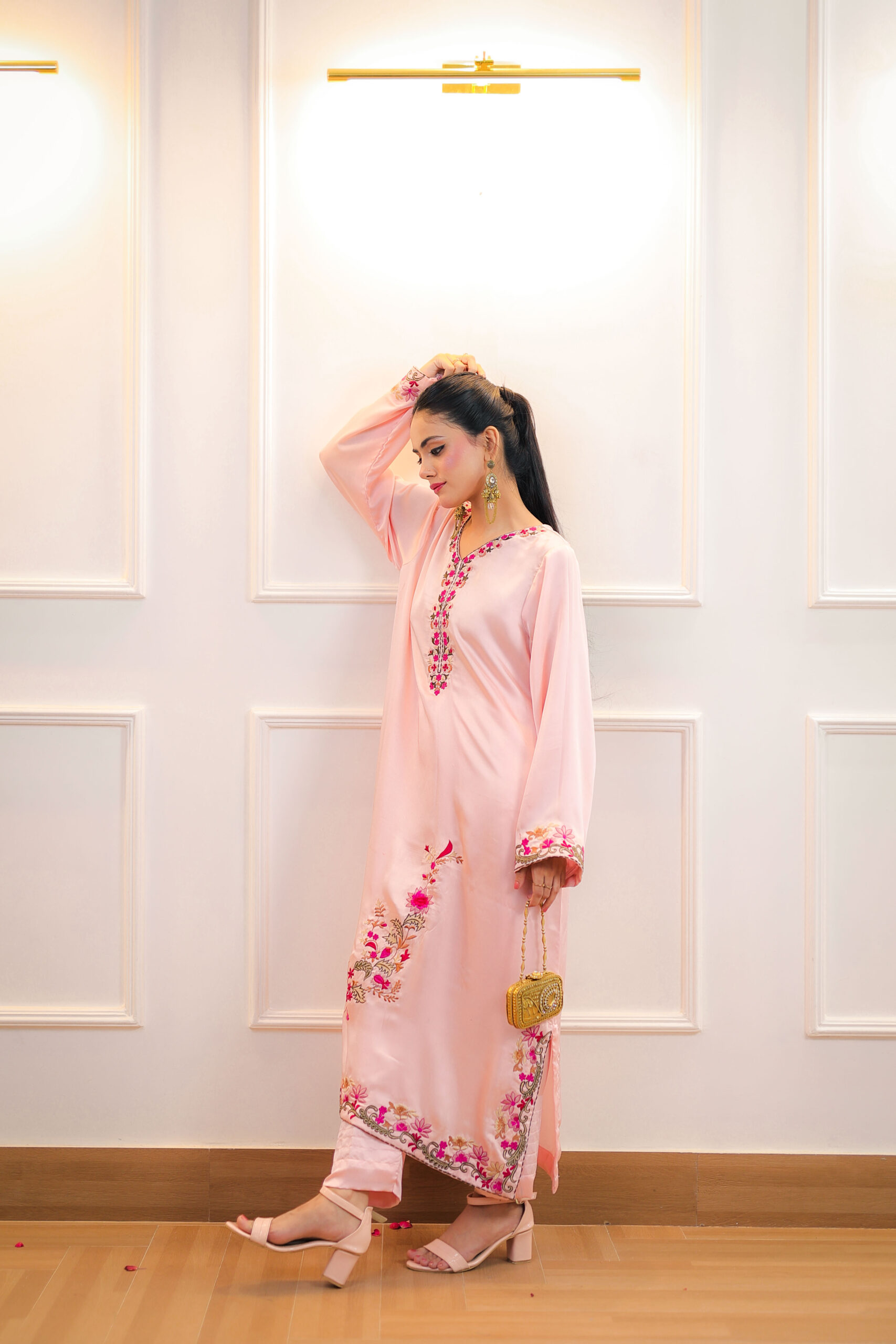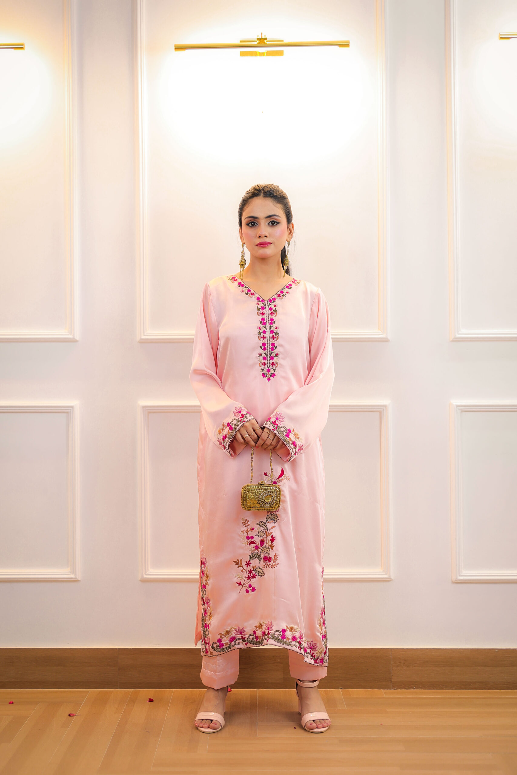 A Pink Raw Silk Kaftan Shirt embraced with Floral Embroidery on front,neckline&sleeves of the shirt.