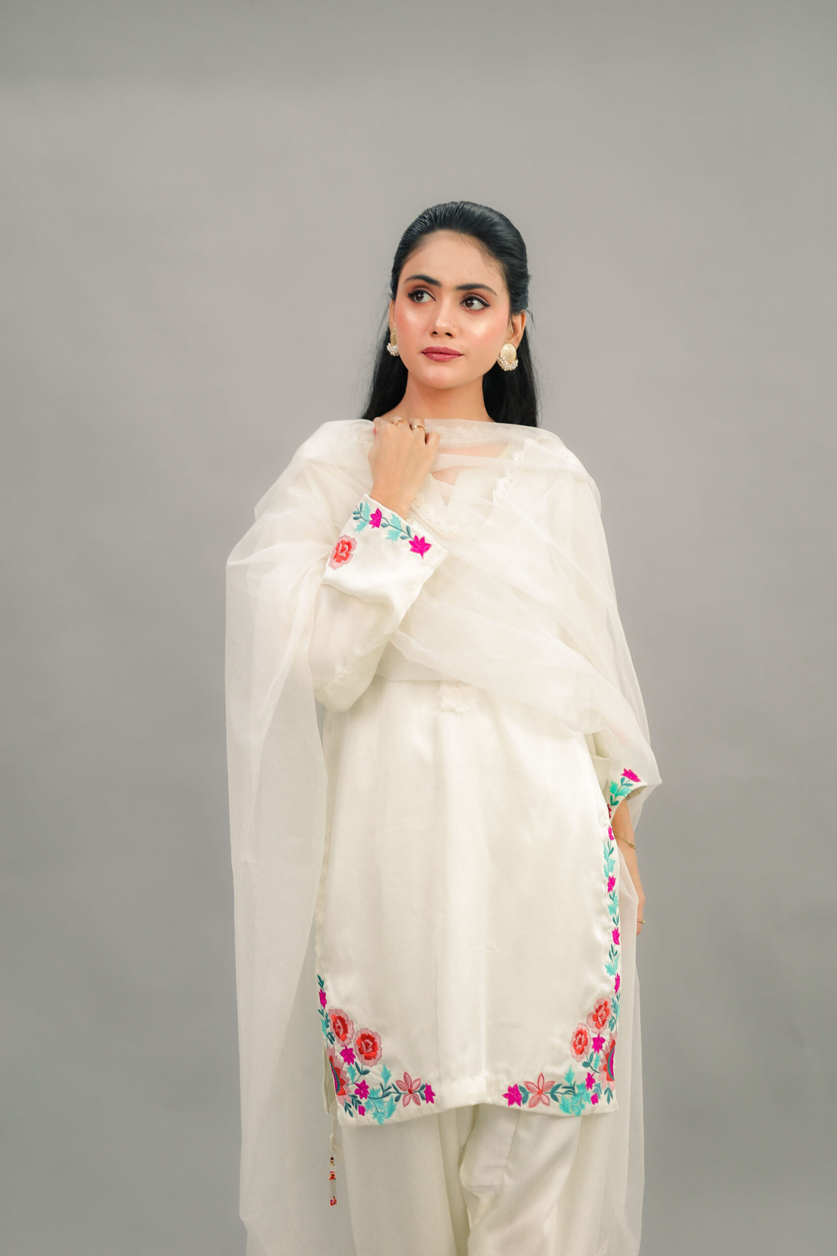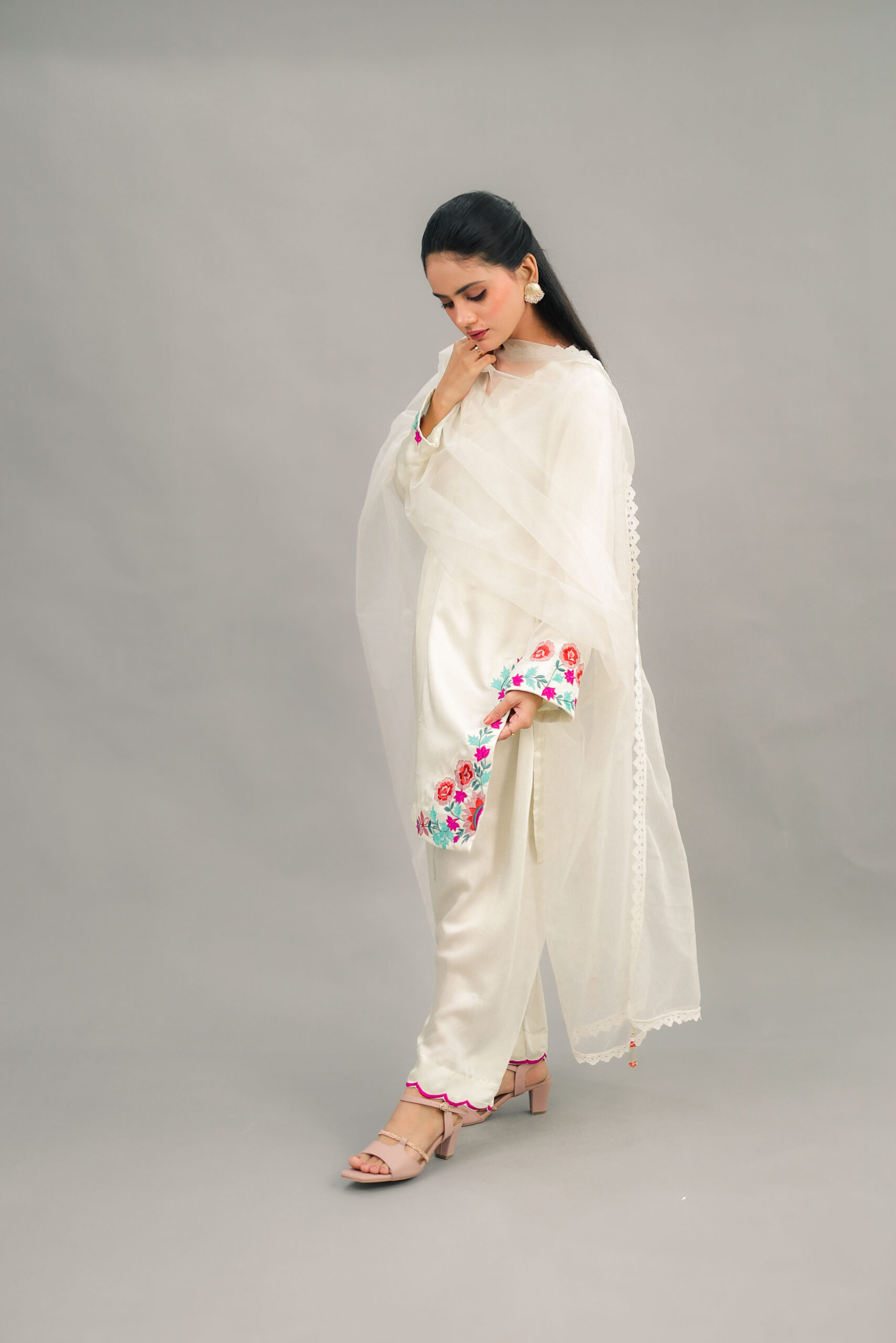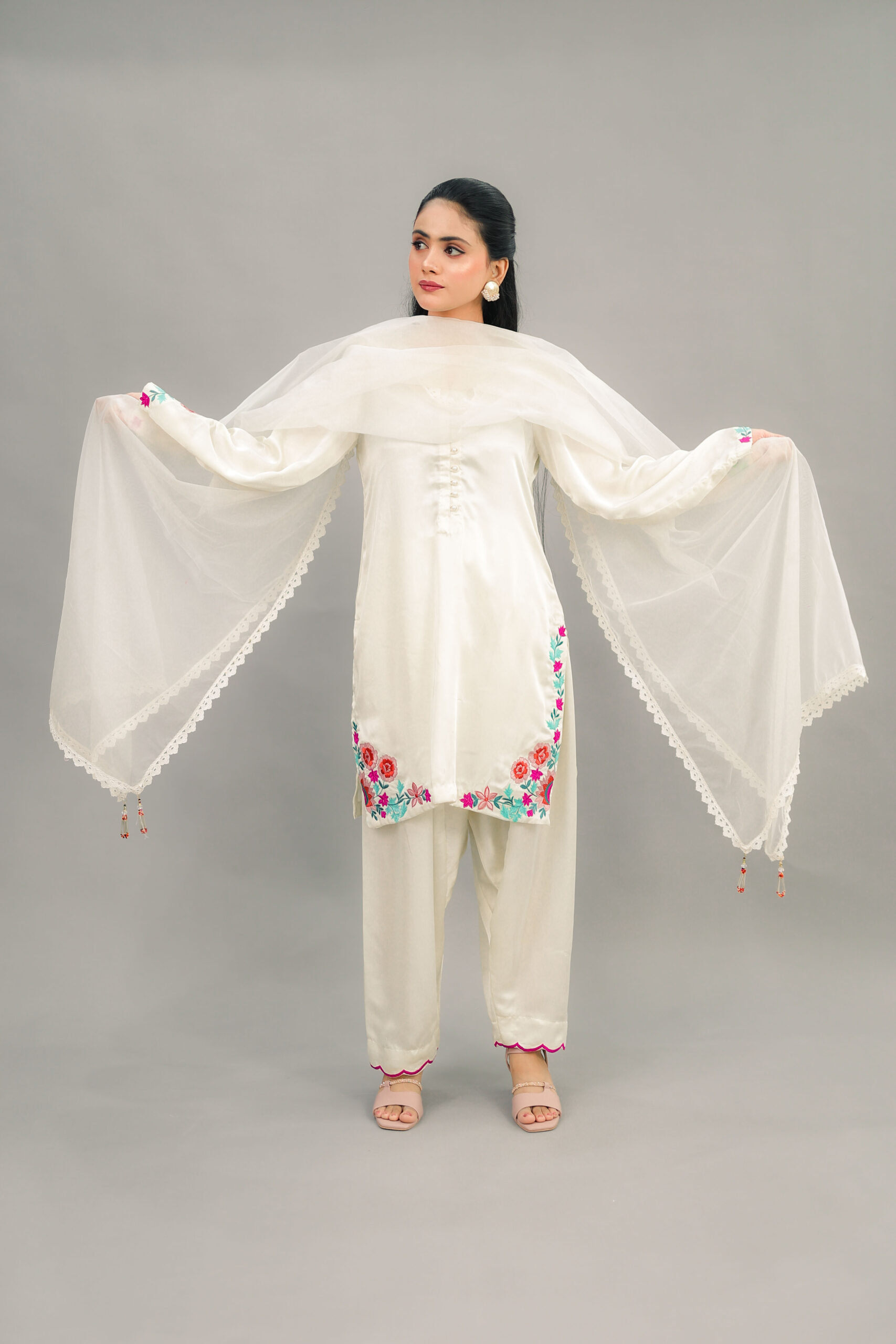 -Bottom is flared Shalwar with embridery on bottom line.
