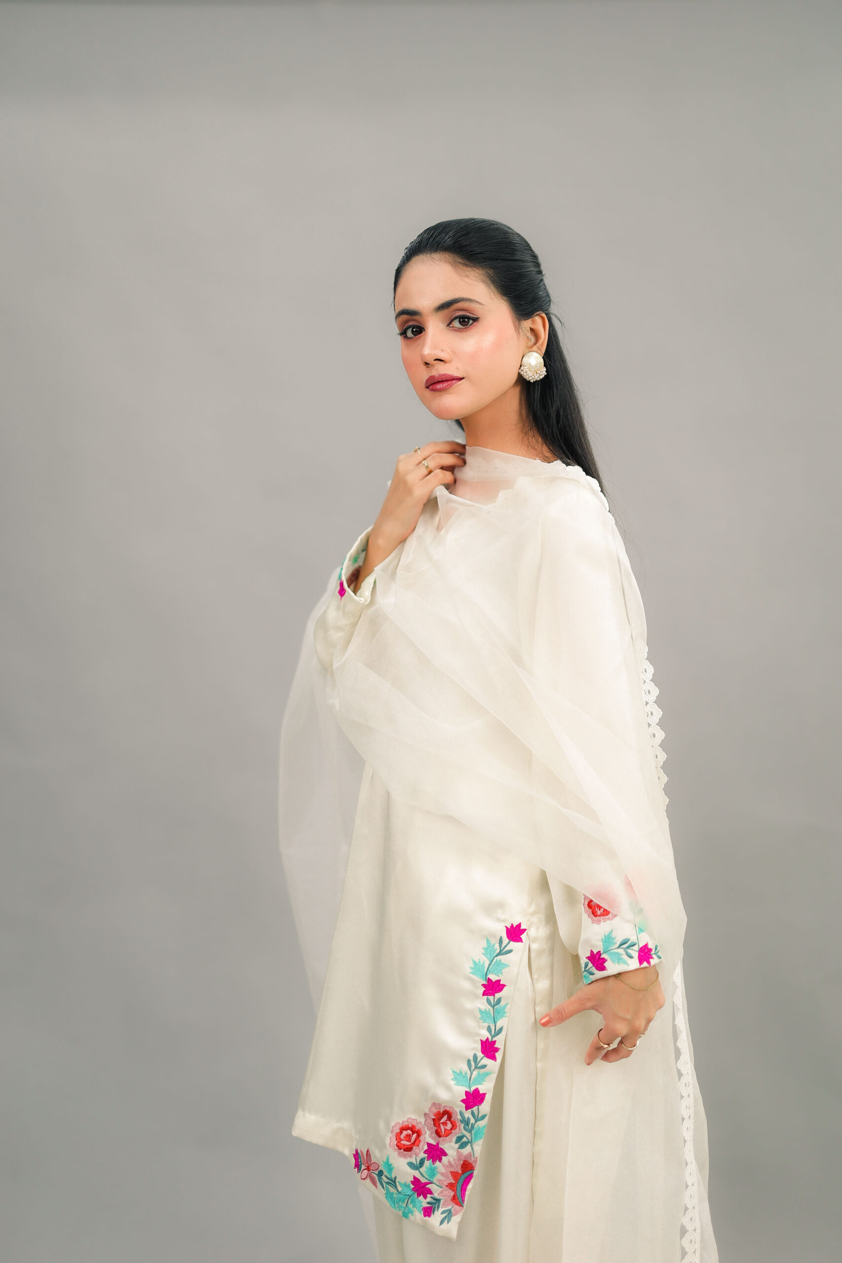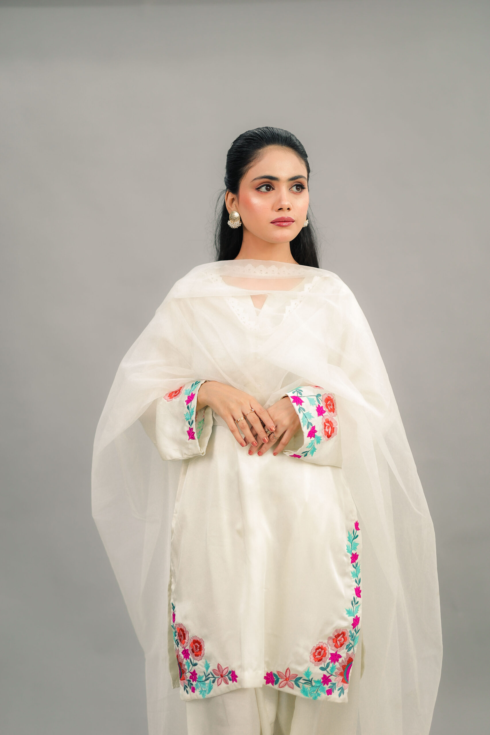 -A Cream Raw Silk short shirt embelished with belecian floral embroidery on Daman and sleeves,and neckline embodied with Pearls.