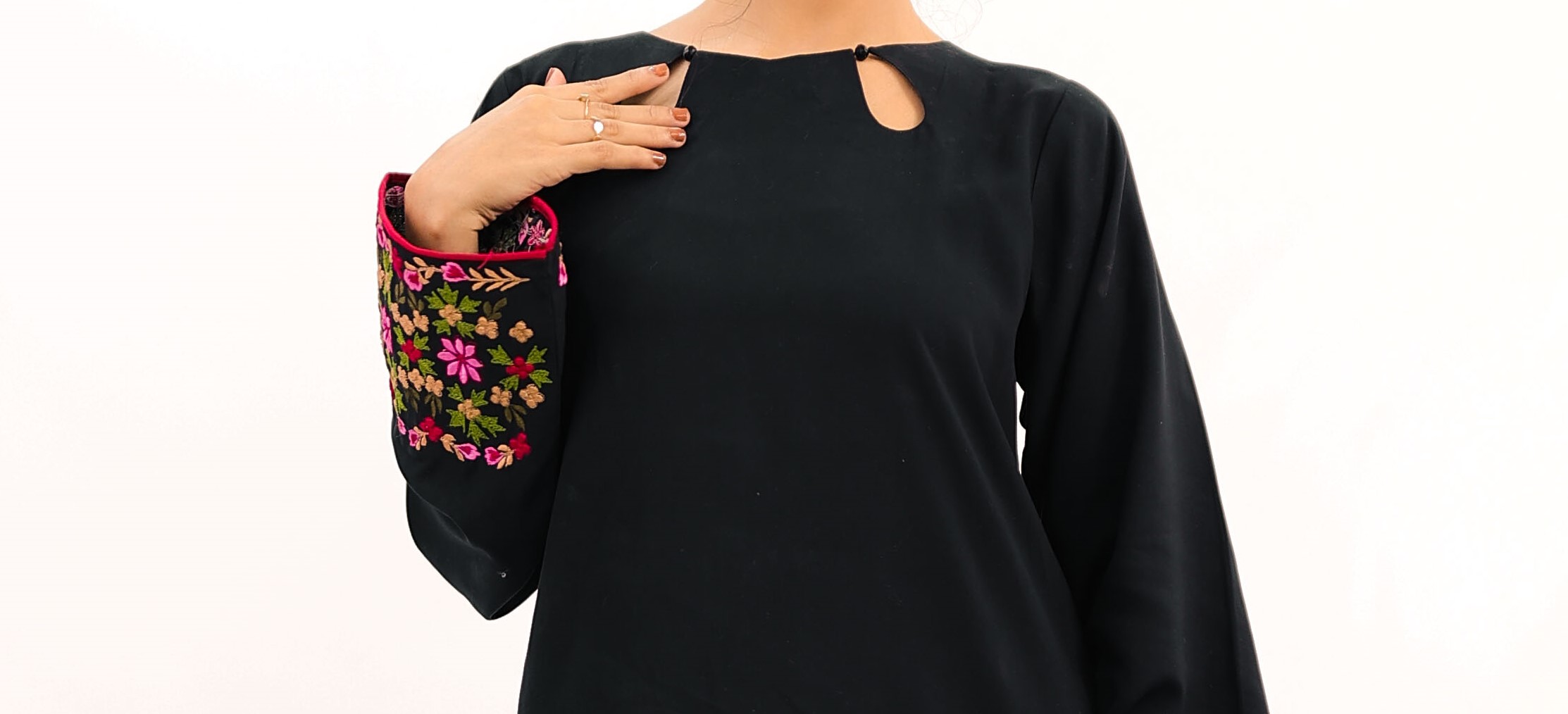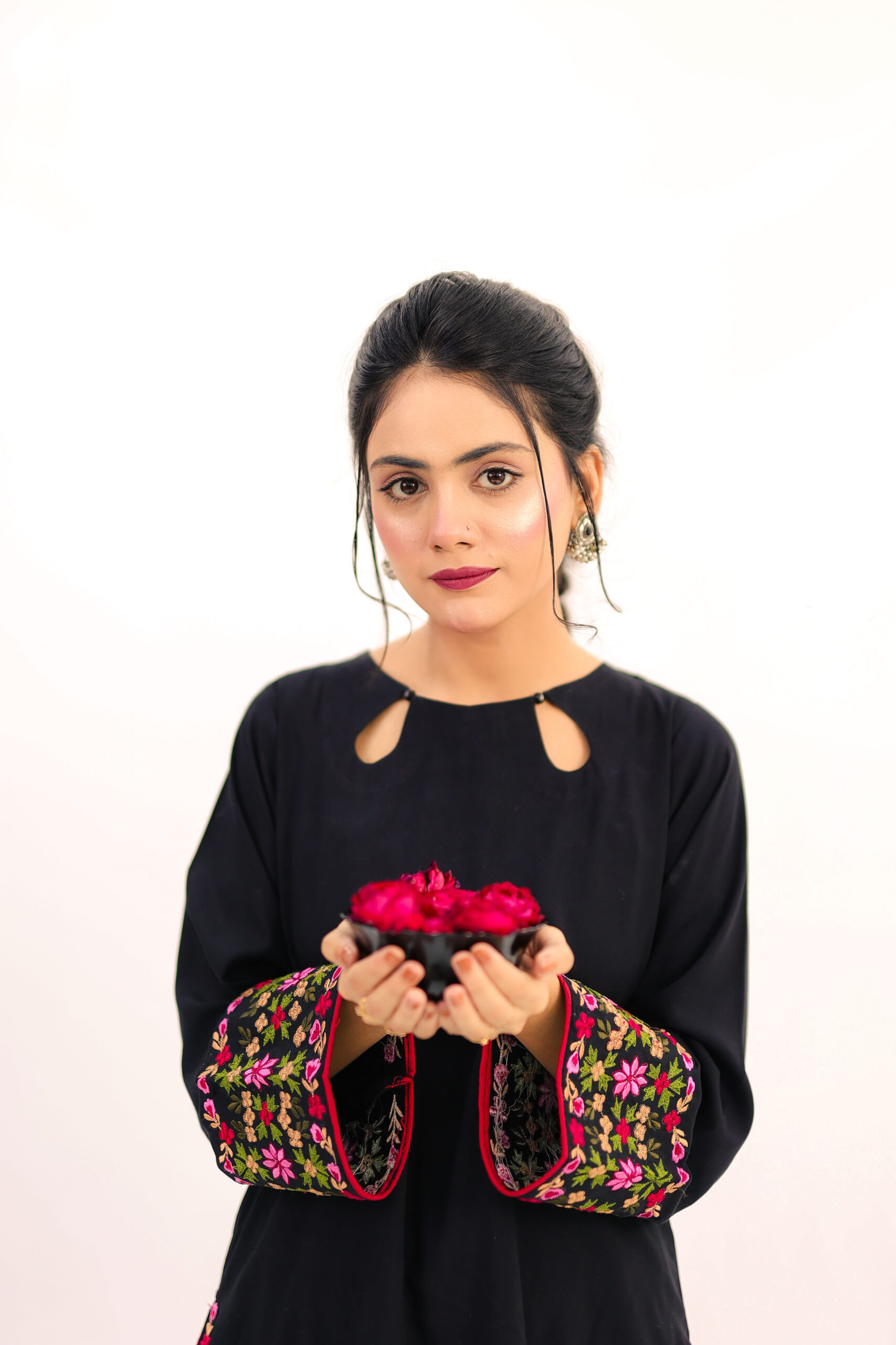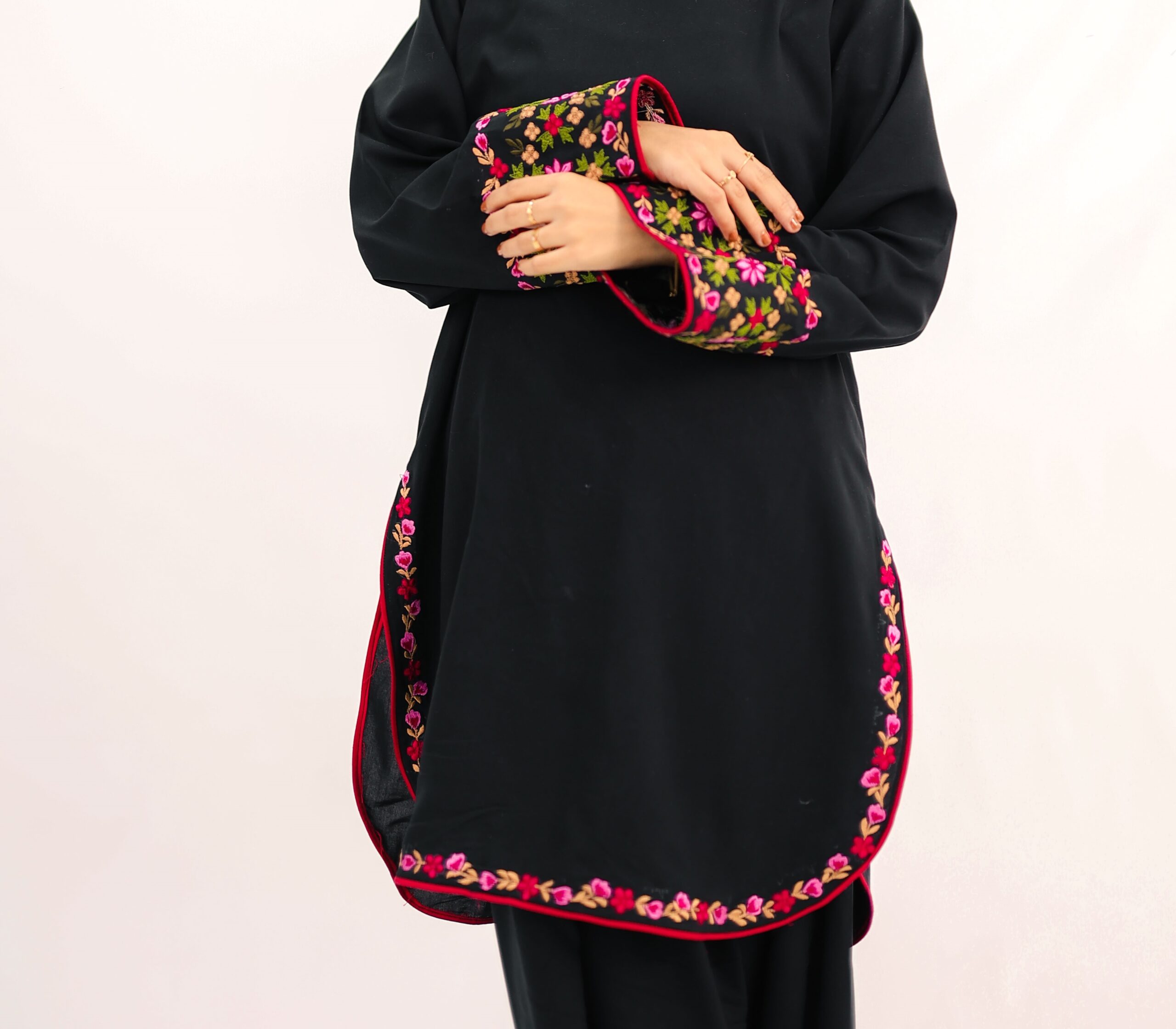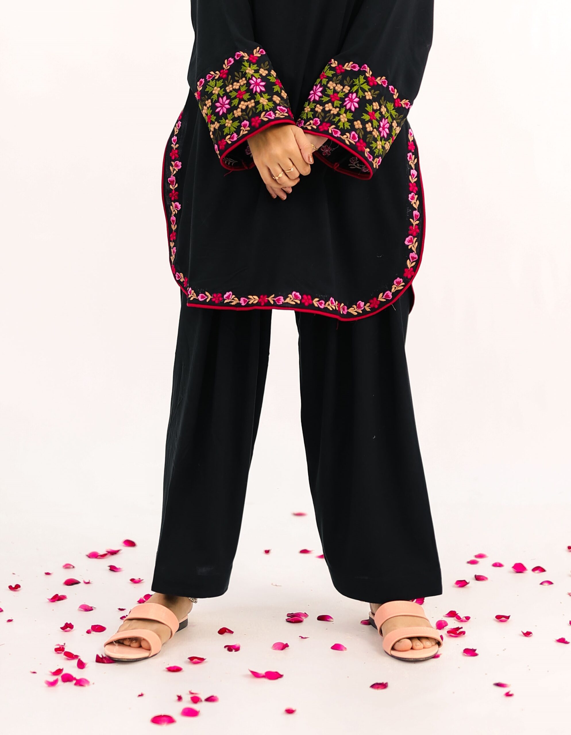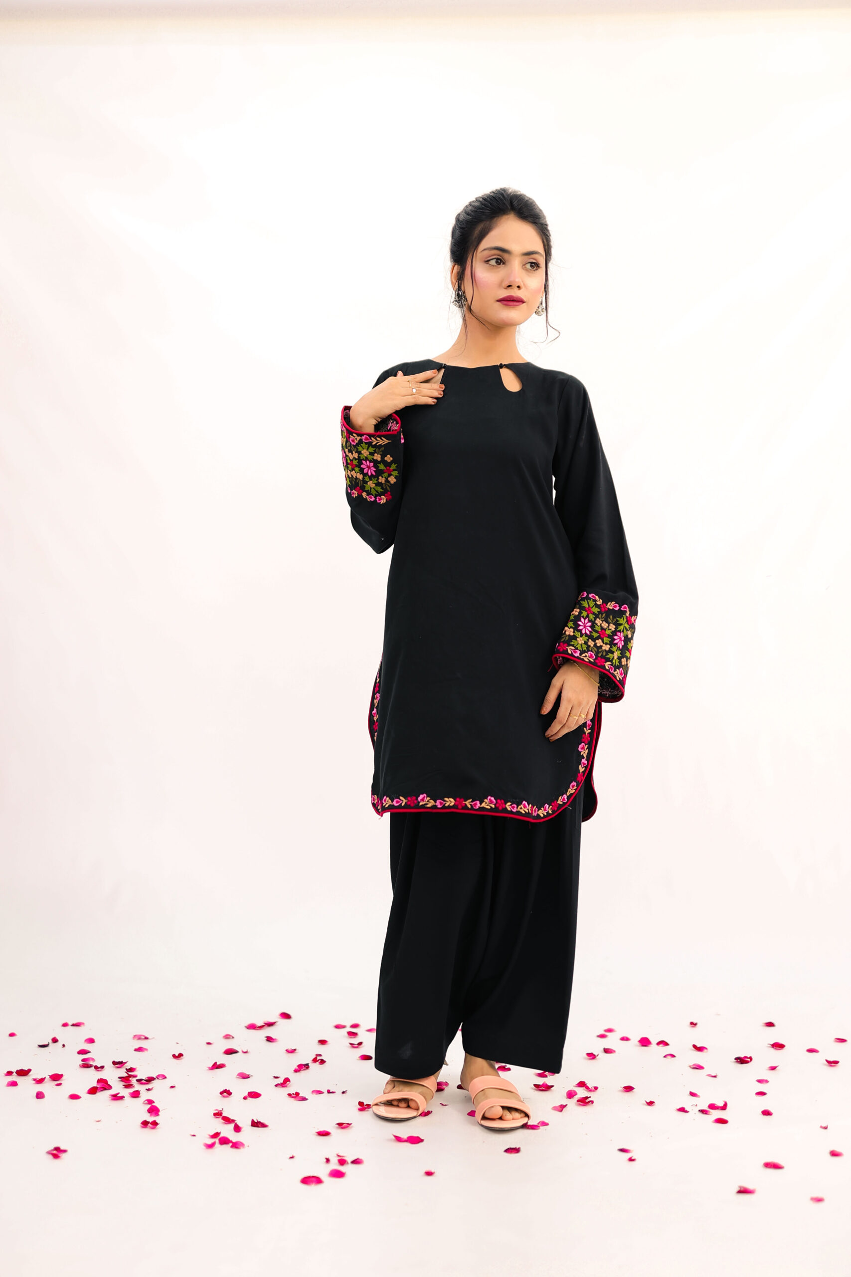 A black base Linen Cambric dress embelished with floral embroidery on Sleeves and Daman and neck has hollow details, serving a complete traditional look in short shirt and flaredĀ  shalwar.